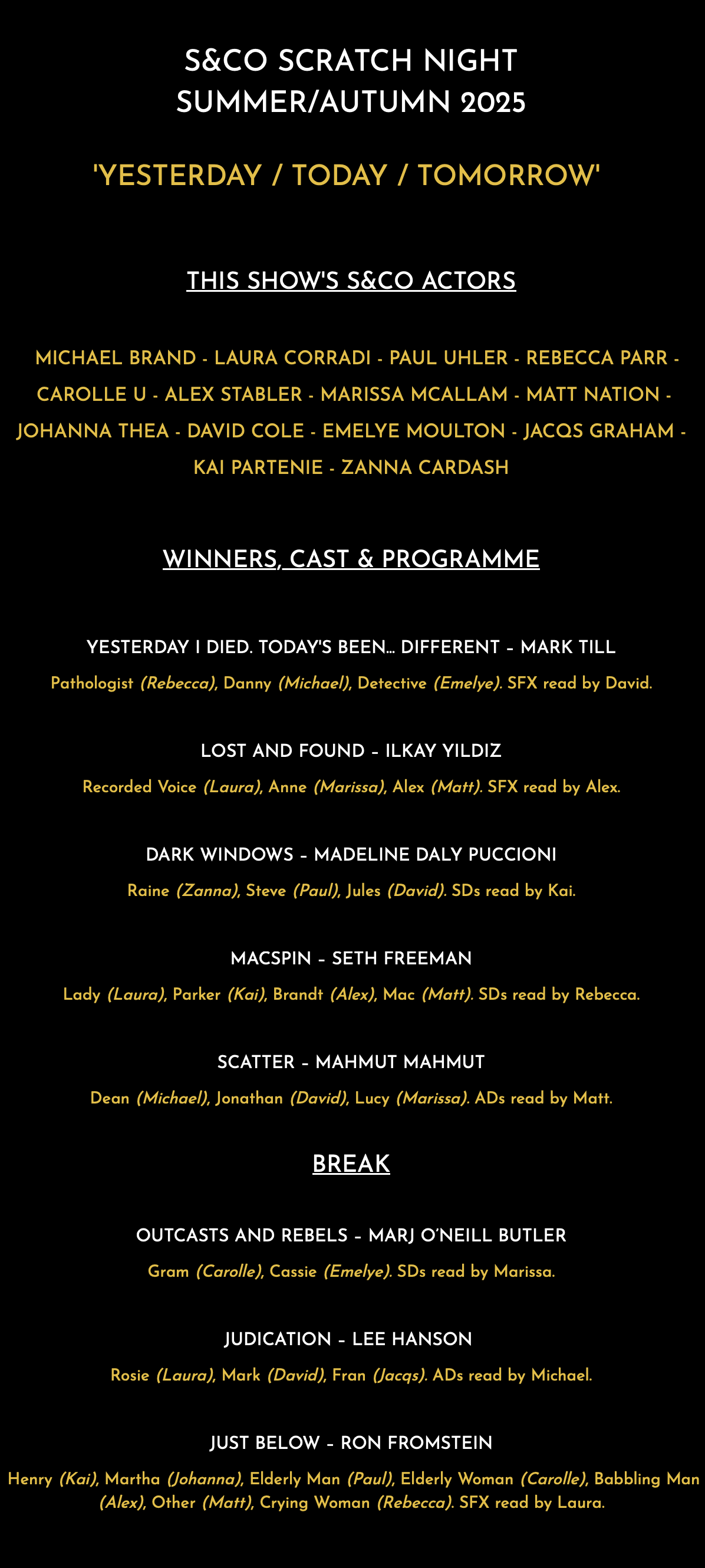 We know how much everyone enjoys our free S&Co Scratch Nights, because you tell us. We usually host two each year, in late summer (September/October) and winter (January/February), giving us ample time to organise and judge the Scriptwriters & Co International Festival.